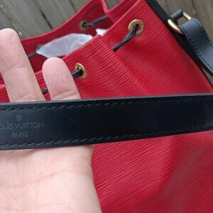 MY AUCTION IS FOR A LOUIS VUITTON EPI PETIT NOE RED BLACK LEATHER SHOULDER PURSE, DATE CODE AR0985 . THIS PURSE IS PREOWNED ABUT LOOKS NICE FOR THE AGE. THE DRAWSTRING CORD DOES HAVE A BREAK IN IT, WILL HAVE TO BE REPLACED SOON , STILL WORKS THE WAY IT IS. NO DUST BAG, YES ITS AUTHENTIC . CONTACT ME WITH ANY QUESTIONS. ALL SALES ARE FINAL.