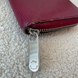 The exterior Epi leather is clean and beautiful with minor hairline scratches. The zipper pull is crisp and bright with very minor hairline scratches. The interior is clean and in excellent condition with faint signs of use.