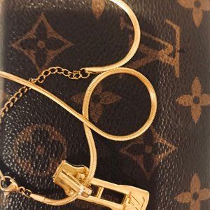 Artsy pop culture temperament bohemian Louis Vuitton gold plated zipper charm on chain! Approximate measurements: 17" with 3" adjustment for shorter choker length; 1.5" Louis Vuitton logo charm! *final photo displays layering option; listing is for charm on original chain only.