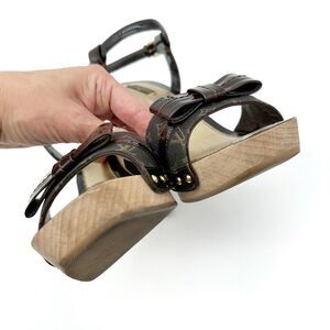 LOUIS VUITTON Idylle Monogram Patent Bow Platform Sandals – Size 38 / US 8 – Brown Canvas & Patent Leather Heels