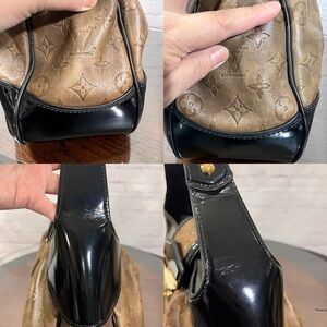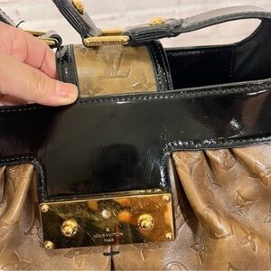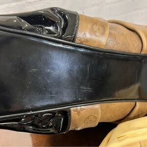 The trademark Monogram pattern is glammed up in embossed calf skin leather complimented by black patent leather trim.