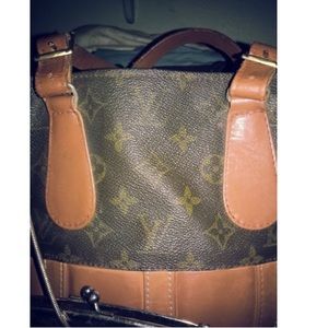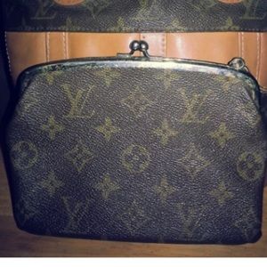 Exterior shows some wear and stains and creasing/cracking on leather and signs of wear on high bottom and straps. Bottom has rubbing with minor tear and surface cracking. Interior lining has light wear . Interior lining Kiss lock pochette bag is included. Date code was not used and the vintage production tag.