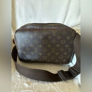 Authentic Louis Vuitton Monogram double zipper crossbody bag with multiple compartments inside.