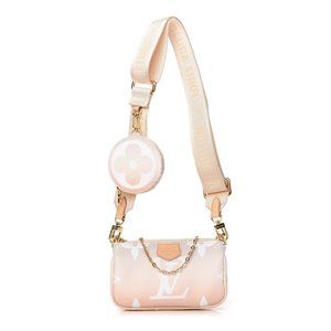Multi Pochette Accessoires is composed of a bag, a pouch, and a round coin purse, all made from pastel-colored Monogram Giant canvas. This hybrid bag features an adjustable jacquard strap with Louis Vuitton Malletier inscribed on it for shoulder or cross-body wear as well as a removable gold-color chain for hand and short-shoulder carry.