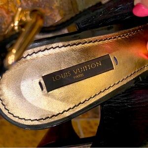 These LOUIS VUITTON Monogram Idylle Slingback Open Toe Pumps w/COA are in Exceptional Used Condition (EUC): Previously lovingly cared for; but this is a preloved (used) item, some normal and minimal wear is expected; stunning heels in great condition! 1" platform and 5" heel; black patent leather with gold hardware, no box or dust bag, not for wide feet, smoke free home, minor wear to hardware and leather, minor scratches throughout, scuffs to bottoms. Depending on device used, color may vary. Review pics as they’re part of the description. Sold as is, no refunds. All auction bids/wins are final, no cancellations.