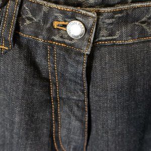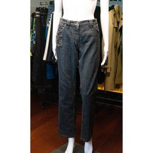 Excellent Condition! Louis Vuitton dark grey mid-rise straight-leg jeans with contrast stitching, six pockets, monogram pattern trim throughout and zip closure at front.