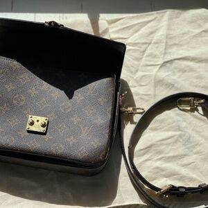 This is an authentic LOUIS VUITTON Monogram Pochette Metis. This handbag is finely crafted of classic Louis Vuitton monogram toile canvas. The bag features a vachetta cowhide leather handle, an optional, adjustable monogram coated canvas shoulder strap, and a rear zipper pocket. The crossover flap opens with a polished gold plated S-lock to a partitioned brown microfiber interior.