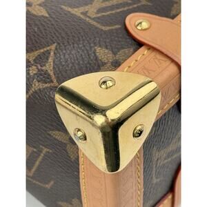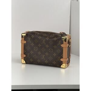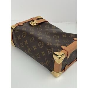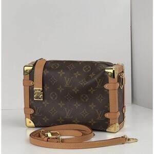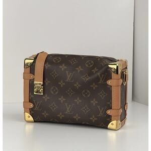 This Louis Vuitton Monogram Side Trunk Bag is a stylish rectangle-shaped shoulder bag for ladies. It features a zip closure, top handle with beige color, and gold hardware. Made of coating canvas with the iconic monogram pattern in brown, it is ideal for travel and casual occasions. The bag has dimensions of 9.5 x 6 x 3 inches and comes with the original dust bag.