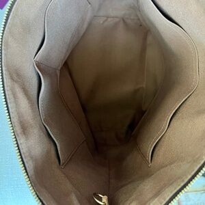 Features Vachetta leather trim and shoulder straps with vintage gold color hardware.