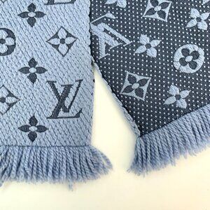 This luxurious Louis Vuitton scarf features the iconic monogram pattern in a sophisticated light blue and navy colorway. The wool-silk blend construction offers both warmth and elegance, finished with delicate fringe detailing.