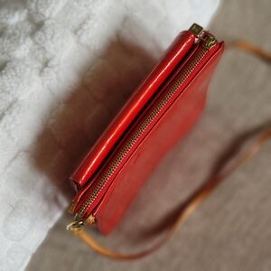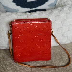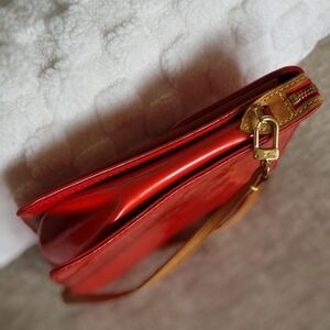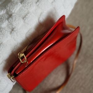 Elegant and stylish, this Louis Vuitton red shoulder bag is perfect for any occasion. Crafted with premium materials, it features the iconic LV monogram. A must-have accessory for fashion-forward individuals. Beautiful Red vernis Shoulder Bag, leather strap great condition, harware perfect, zipper works very good, stamp.and date code on pictures, made in France 2002, very chic look, great for any occasion,!!!..(little dot stain on the back bottom side..see picture).
