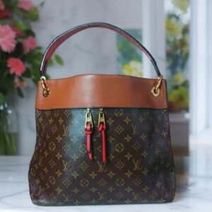 The Louis Vuitton Tuileries Besace is a chic and modern shoulder bag crafted in classic Monogram canvas with tricolor leather accents in caramel, red, and black. With its bold yet elegant design, this bag is perfect for everyday sophistication.
