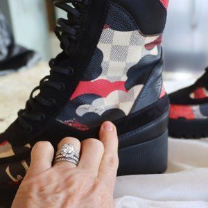 100% AUTHENTIC. Desert boots with a Damier canvas, multicolored overlays on the toe trim and tongue, black suede trim, 2-inch black leather platform heels and leather laces. Never worn and was featured on The Real Real, commission was too much so I decided to sell them myself. I do not have the box or dust cover.