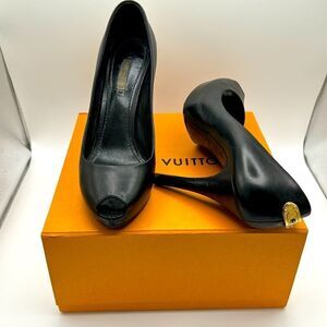 π― Authentic Louis Vuitton Oh Really Black Patent Gold Lock Platform Peep Toe Pumps. The shoes are the classic "Oh Really" platform peep toe pumps in black patent leather. They have the iconic LV logo engraved padlocks at the back in gold tone hardware, 3/4" hidden platforms, and 4 1/4" heels.