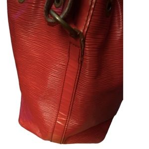 Louis Vuitton vintage Petit Noe shoulder bag in red. Condition is preowned in good condition. This medium size bag was made in France 1930 -89. Exterior material is red Epi leather with Interior lining black suede leather with gold tone hardware and drawstring closure Dimensions approximated are W 9.8 x D7.5 inch x H 10.4" (inch) W 25 x H 26.5 x D 19 ( cm) with Shoulder drop of (inch/cm) 9.1 - 11.8" / 23 -30 cm tem specifics