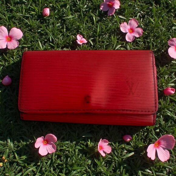 This Louis Vuitton Red Epi Leather Keyholder Case is a luxurious accessory, boasting a vibrant red hue and high-quality Epi leather construction. It offers a sleek design with a secure clasp for key storage.