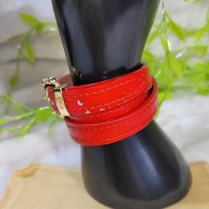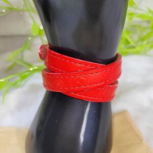 This stylish bracelet is crafted of glossy patent vernis leather in red that wraps three times around the wrist and affixes with a gold tone buckle.