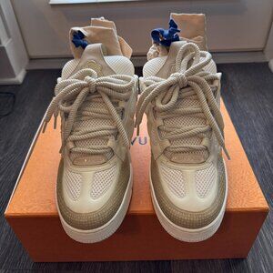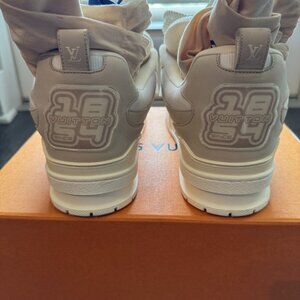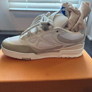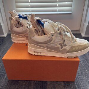 "The LV Skate sneaker references a Nineties-inspired design first seen at Louis Vuitton's Fall-Winter 2022 men's show. Its elaborate, bicolor upper with Monogram Flower detailing combines technical mesh, calf leather and suede. This model is notable for its padded collar, technical double laces and bicolor rubber outsole decorated with Monogram Flowers."