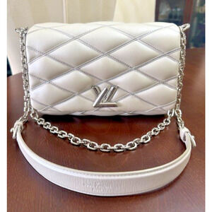 The Louis Vuitton Silver/White Pearl Malletage Leather GO-14 PM Bag Purse is a medium-sized shoulder bag designed for women. It features a white exterior with a silver lining, accented with white hardware and a metal handle/strap. The exterior material is leather with a Louis Vuitton Malletage finish, making it a luxurious and stylish accessory. This designer handbag is perfect for those who appreciate classic, timeless elegance and luxury fashion.