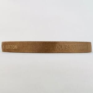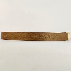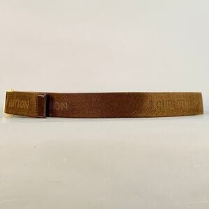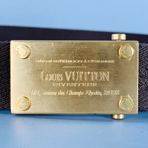 LOUIS VUITTON "Inventeur" belt in a brown canvas featuring a textured logo pattern, and branded gold tone metal box buckle closure. Made in Spain.
