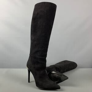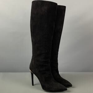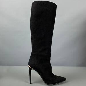 LOUIS VUITTON boots in a black suede featuring a knee high pull on style, gold tone heel detail, and pointed toe. Made in Italy.