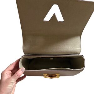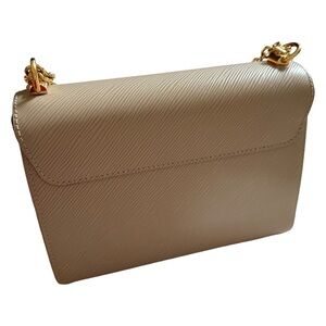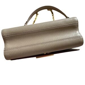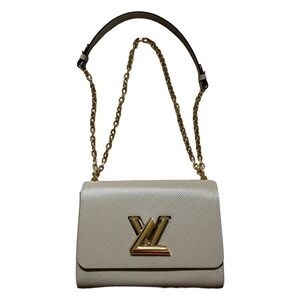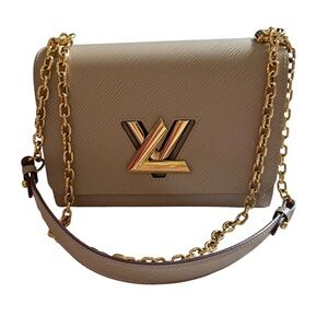 Tan bag from Louis Vuitton. This is the “Twist MM” shoulder / crossbody bag from Louis Vuitton in the color “Galet.” The purse is made from luxurious epi grained cowhide leather with eye catching gold hardware. The purse features the iconic LV twist lock and a sliding chain strap which allows it to be worn as a shoulder or crossbody bag. The bag has an interior flat pocket with a zipper and another interior flat pocket that comes with a removable handheld mirror (which still has the protective film on it). This bag is in pristine preloved condition. It has a couple scratches on the LV twist lock from minimal use but these scratches are hardly noticeable when the purse is being used. It has been priced according to this flaw.