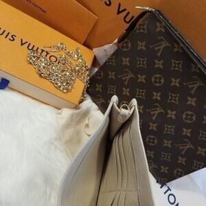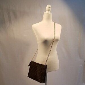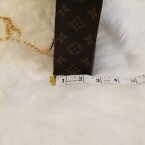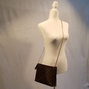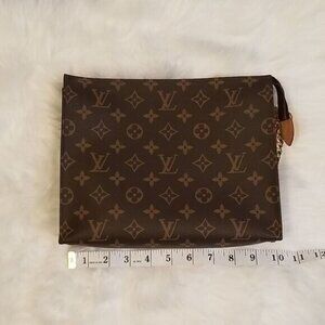 This Louis Vuitton Toiletries Bag is a perfect accessory for any occasion. It features a beautiful Monogram pattern on a brown exterior canvas, with a tan canvas lining. The bag comes with a unbranded gold metal chain strap, making it a versatile crossbody accessory. The bag is medium-sized and perfect for carrying your daily essentials. The Louis Vuitton Toiletry Bag is a must-have for any fashion-conscious individual who wants to add a touch of LOUIS VUITTON TOILETRIES BAG 26 MONOGRAM to their collection!!