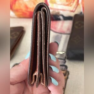 💥This practical small wallet is finely crafted of LV Monogram canvas with a gold snap closure. Iinterior is terracotta colored cross grain leather with 5 card slots, billfold pocket for cash/receipts, and a wrap around zipper that opens to a double pocket for coins etc.