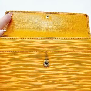 This stylish orange epi wallet is by Louis Vuitton. Its vibrant color adds a pop of brightness to your outfit/purse. Snap closure. It has 2 sections and one large zipper section along with 2 card slots on one section and 4 on the inner section. See photos for condition as there is some normal wear especially to the edges and on/near the gold hardware.