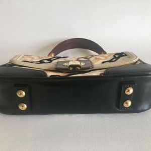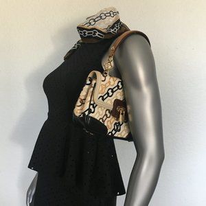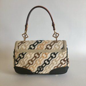 Limited Edition LV Monogram Charms Velvet Chain Rabat Pochette Bag. Rare find, 2006 spring summer collection by Mark Jacobs. Silk intertwines with chains of velvet black, browns, & beige. Black & brown leather strap. Flap top with flip padlock lock closure. Some scuff marks on front brown leather square, lock minor scratches, interior super clean, bottom of black leather has some creases, part of the leather texture. 9.5"L x 2.5"W x 6.5"H 5.5 handle drop. SCARF NOT INCLUDED.