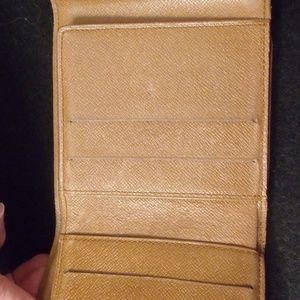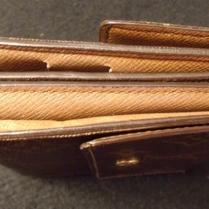 Size of wallet is 4"L x 5"W x 4.5" H. The wallet has a separate outside change purse. Snaps are tight. Vintage Louis Vuitton brown monogram tri-fold wallet. This wallet is in good used condition. As you can see in the last picture, the "bills" section has wear. It is not sticky, just not in new perfect condition. When I bought it, I used it right away, there was no problem with the "bill" section. This wallet fits perfectly in the LV purse that I am also selling. I need a full size wall