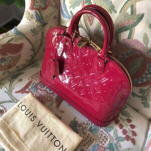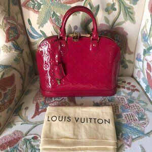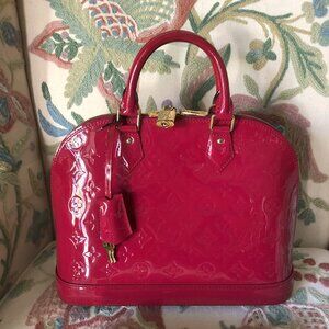 Add a fabulous chic pop of color to any outfit with this gorgeous Louis Vuitton Vernis Alma PM in vibrant Indian Rose. Exquisitely crafted from Louis Vuitton monogram embossed Vernis shiny patent leather. Featuring rolled top handles, gold-tone hardware and a pristine fabric interior with patch pockets. This elegant handbag is a true timeless classic and an ideal size for everyday use.