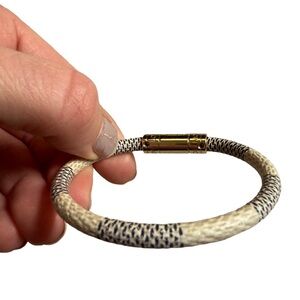 White and blue bracelet from Louis Vuitton. This is the “Keep It” bracelet from Louis Vuitton in “Damier Azur” which has since been discontinued. This bracelet is made from Damier canvas and has a gold clasp. The bracelet is in excellent preloved condition with no flaws.