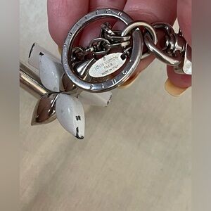 This beautiful LOUIS VUITTON LV Twist key holder and bag charm features a white resin and silver-tone metal LV design with a small flower⭐️It can be used as a key holder or to add flair to a bag⭐️White resin does need touch up in some areas(see pix)easily can be touched-up⭐️has a nice weight to it & is such a kool accessory to add to your collection⭐️