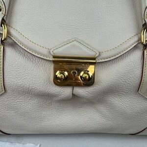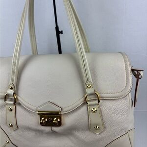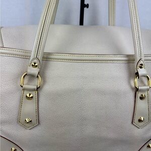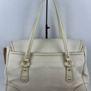 This elegant cream leather handbag features gold-tone accents, perfect for any occasion. Its sophisticated design adds a touch of luxury to your ensemble this bag is in good condition with some minor rubbing on corners and scratches inside little dirty with ink stains other than that gorgeous tote bag.