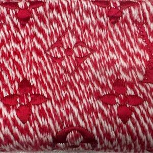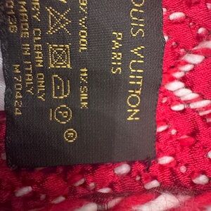 The scarf has the typical Louis Vuitton pattern, made of 89% wool and 11% silk. The colors are red and white, and it feels soft. This warm Louis Vuitton scarf will keep you warm during the winter holidays or can be a great addition to your clothing collection.