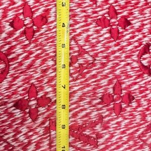 Elegant red and white silk and wool scarf with iconic Louis Vuitton pattern. Adds luxury and style.