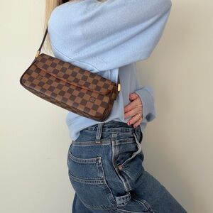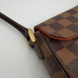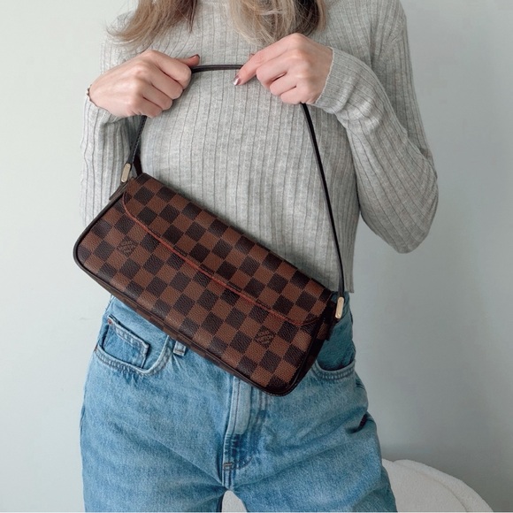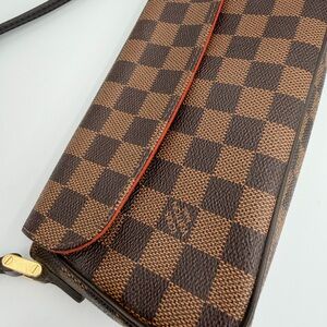 Damier Ebene brown coated canvas shoulder bag. From the 2004 collection by Marc Jacobs. Brass hardware. Dark brown leather trim. Single leather shoulder strap. Alacantara lining & single interior pocket. Snap closure at front.