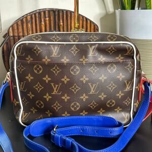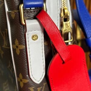 This limited edition LV x NBA Nil PM bag is of monogram coated canvas with golden brass hardware and features the NBA logo, white leather trim, a zip closure, a removable leather luggage tag, back slip pocket and an adjustable blue leather strap.