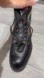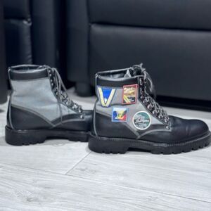 These are an authentic pair of LOUIS VUITTON Calfskin Oberkampf Ankle Boots size 8.5 in Black. These sturdy boots are crafted of black leather and feature signature Louis Vuitton patches, grey laces, and dark silver hardware.