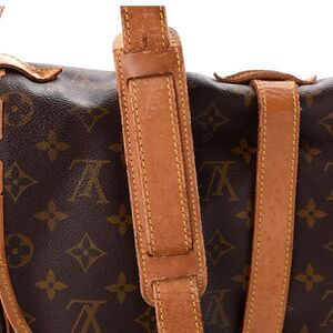“This is an authentic LOUIS VUITTON Monogram Saumur 35. This saddle-style messenger bag is crafted of Louis Vuitton monogram toile canvas. The bag features vachetta cowhide leather trim, an adjustable crossbody strap, and a belt and brass buckle closure for the flaps. This opens to a brown fabric interior with patch pockets.”