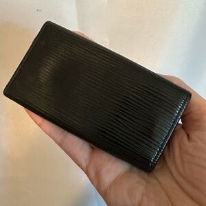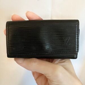 Authentic Louis Vuitton pre-owned Black Epi Leather 4 hook key Case. Black “Epi” leather key case with four gold metal key hooks accented by embossed “LV” logo on front.