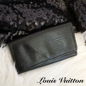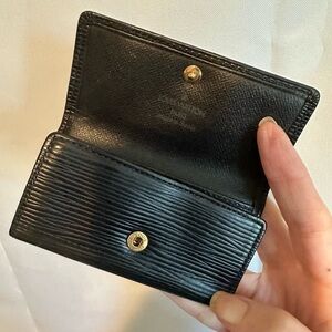 Authentic Louis Vuitton pre-owned Black Epi Leather 4 hook key Case. Black “Epi” leather key case with four gold metal key hooks accented by embossed “LV” logo on front.