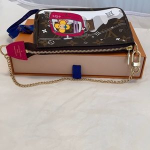 Authentic, NIB, Louis Vuitton Limited Edition Mini Pochette Accessories "VIVIENNE" Holiday Edition. This special Holiday edition of the Mini Pochette Accessories in Monogram canvas, celebrates Louis Vuitton's travel heritage. The playful, brightly colored illustration, shows the House's Vivienne mascot, taking a cable-car ride in the chic ski resort of Courchevel. Sold out. Includes box, ribbon, sleeper and tag. Guaranteed authentic. SF3159. France. 9002V615A.