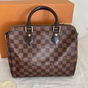 Authentic, Louis Vuitton Speedy 25 Bandouliere in Damier Ebene. Excellent condition, as bag was only carried a handful of times. Corners show no wear, no scratches to leather, no wrinkling of strap. Canvas in excellent condition, minimal scratches to hardware, if any. Handles are clean. Inside pristine with no stains or odor. Some tarnishing of hardware. Slight wear at side strap (last pic). Stock is always low on this item. Includes box, dust bag, lock and two keys, strap and barcode tag. Price is firm. #0412P207919.