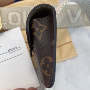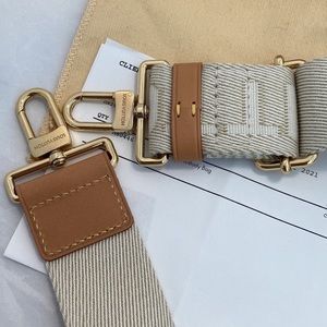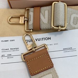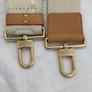 Authentic Louis Vuitton Utility bag strap and monogram pouch. Gorgeous beige strap, with LV signature throughout. Honey wheat leather tabs, golden hardware. Strap length is approx: longest: 45", shortest: 25 1/2", width: 1 5/8" New, never worn. Pouch is removable and strap is adjustable. 2302V103073. Includes box, dust bag. ** Please note: Handbag is not included. It is just to show how well this straps coordinates with the Damier Azur pattern with patina Vachetta leather.