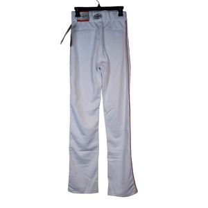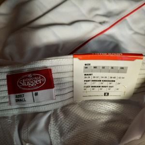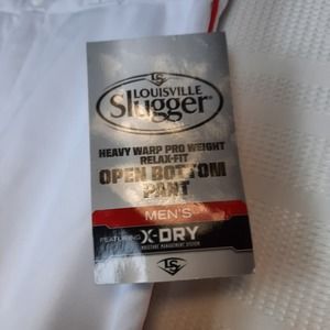 Elevate your baseball game with these premium Louisville Slugger Men's heavy warp double knit pro weight fabric. X-dry moisture management system. Cool, dry, great comfortable fit. Relax fit, open bottom. Anti-roll waistband. Tunnel belt loops. Two snaps. Zipper. Double knee construction. These pants are designed for the ultimate comfort during intense games. Whether you're a professional or casual player, these pants are perfect for you. NWT. Adult Small. Waist 26"-28" Inseam 26" Length 33"