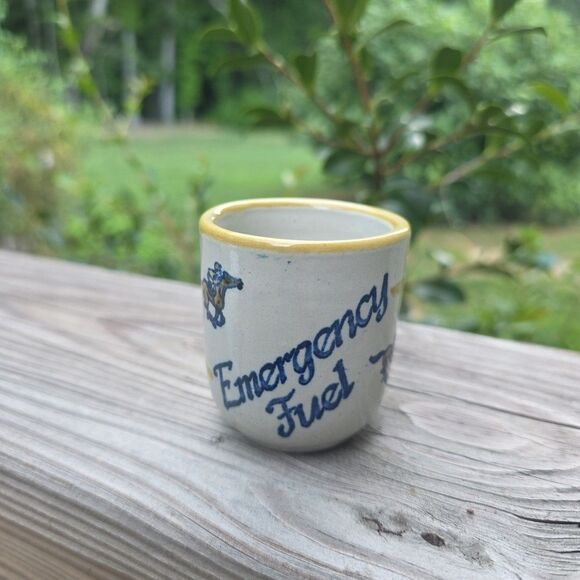 LOUISVILLE STONEWARE "Emergency Fuel" Shot Glass Racehorses Made In Kentucky VTG