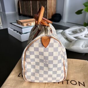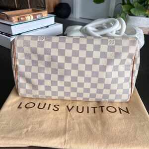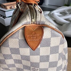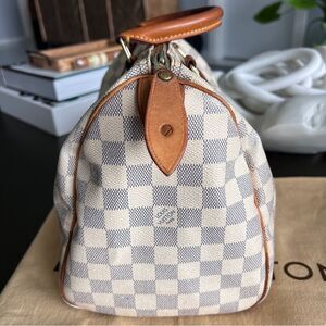 This Louis Vuitton Speedy 30 handbag features the iconic Damier Azur canvas in a checkerboard pattern of white and light gray squares. The bag showcases natural cowhide leather trim and handles with gold-tone hardware, including branded rivets and zipper pulls. It is designed in a compact, structured shape ideal for everyday use, combining style with functionality.