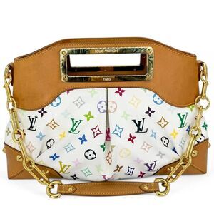 Features : Louis Vuitton Takashi Murakami white multicolor Judy bag ; crafted in France circa 2009 from white coated canvas with multicolor monogram , features gold tone hardware, natural leather finishes, cut out handles, chain shoulder strap, top snap closure, bottom studs and alcantara interior lining.